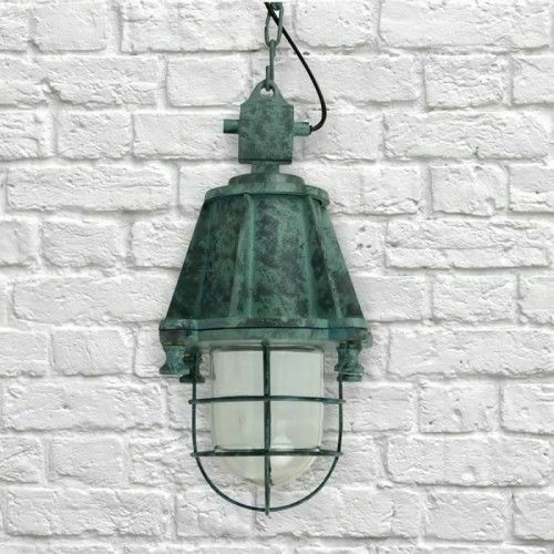 A verdigris coating gives this pendant lamp an aged appearance. A chunky 47cm pendant incorporates a 360-degree clear glass lens protected inside a metal cage.