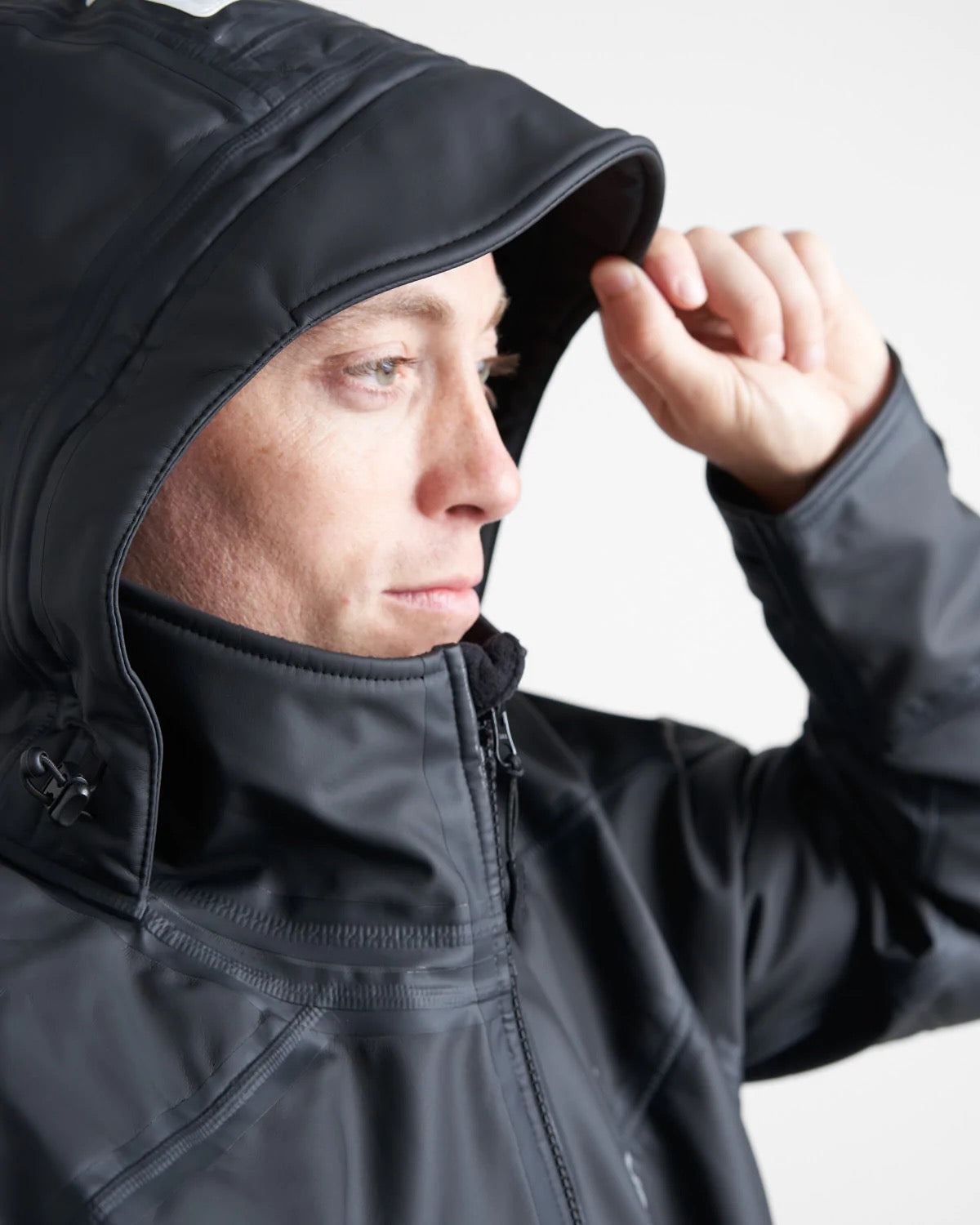 The wrists feature a double cuff construction with a soft, elasticated lycra binding on the inside and Velcro adjusters on the outside. There’s a headphone access point on the inner pocket, two deep fleece-lined outer pockets with heavy duty waterproof YKK zips to keep things warm and dry. The high standing collar and colour-matched, tailored, peaked hood keeps the wind and rain out